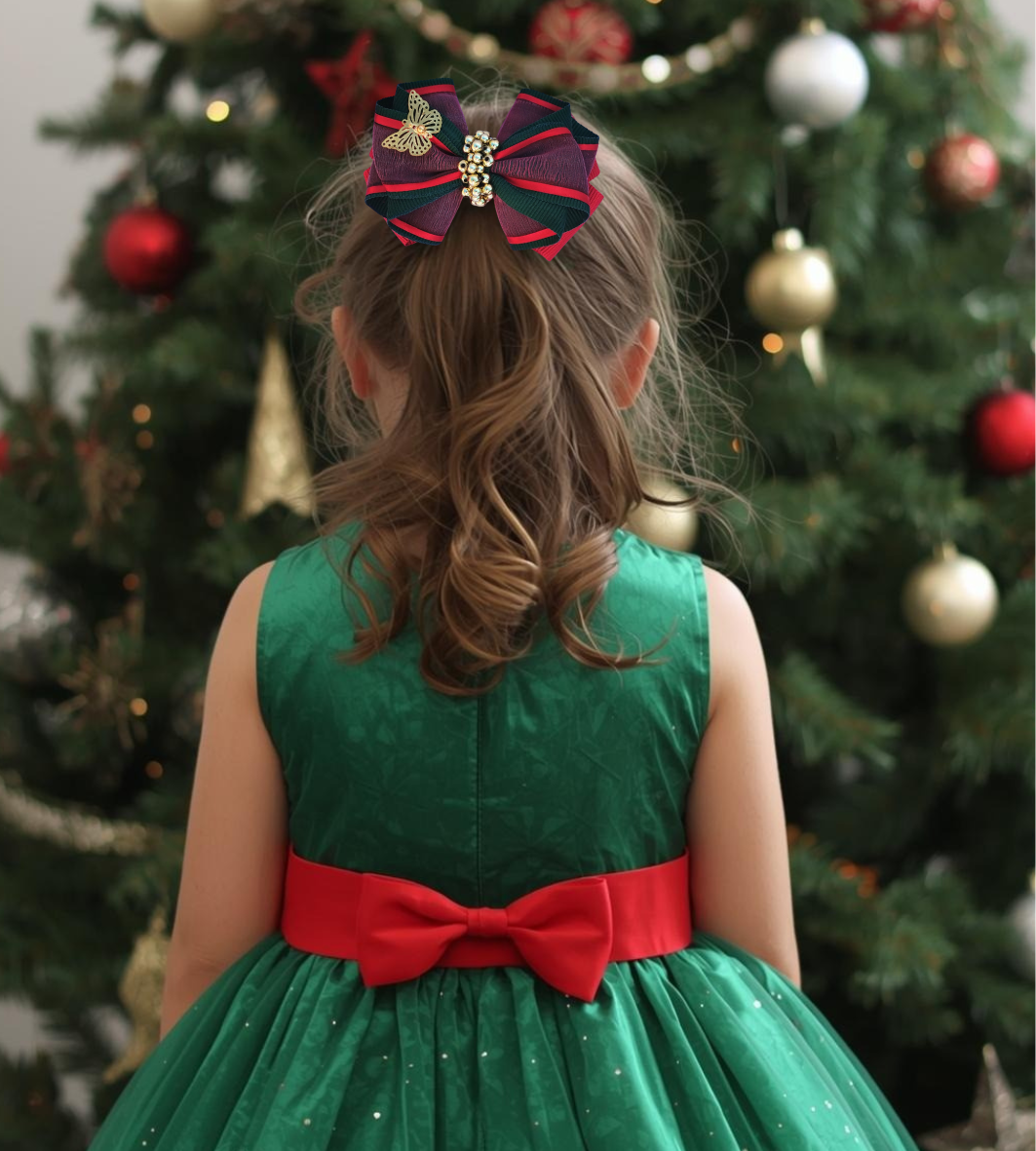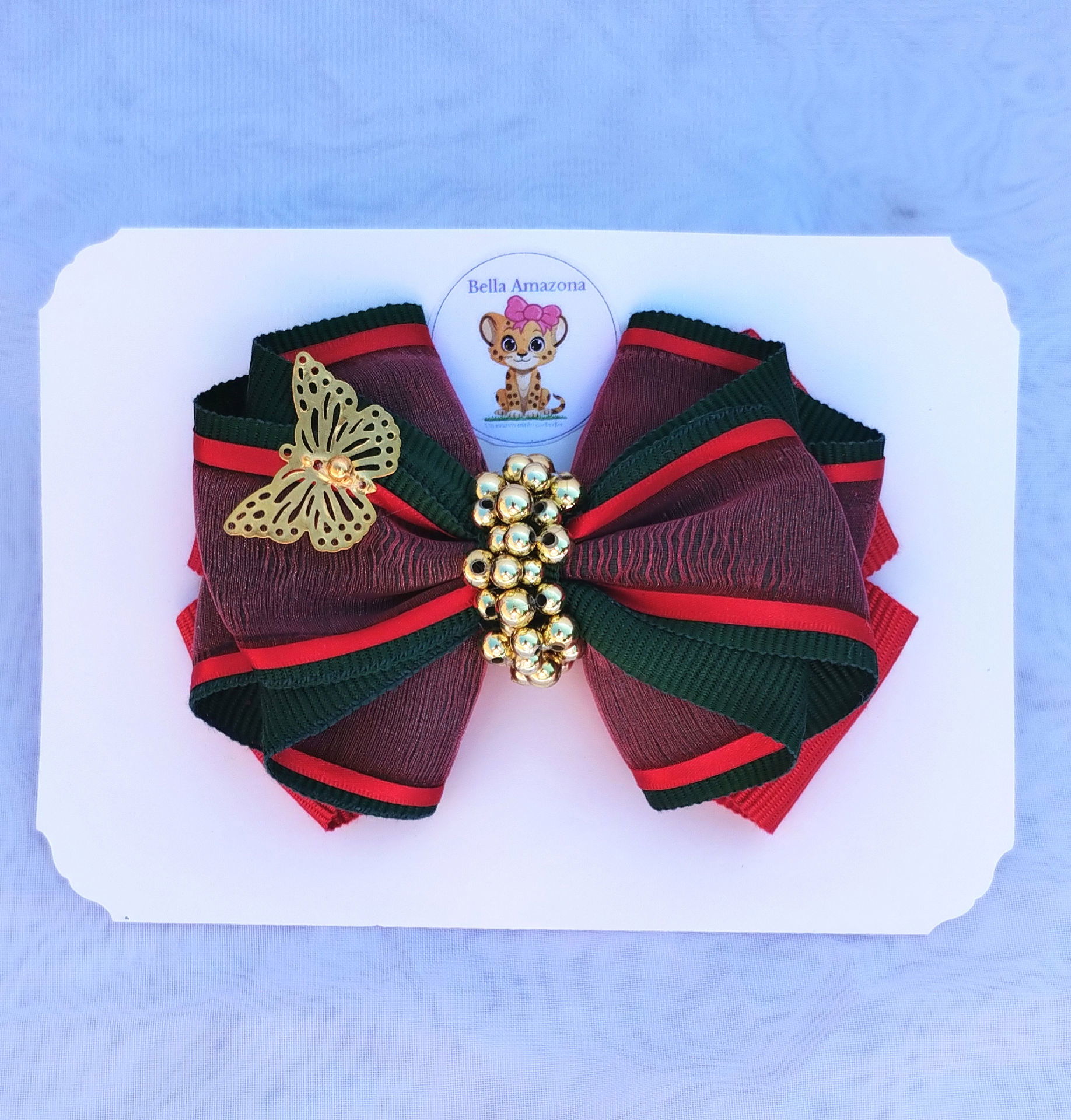 Elaborado en cinta gross y organza con centro de perlas doradas y mariposa dorada.